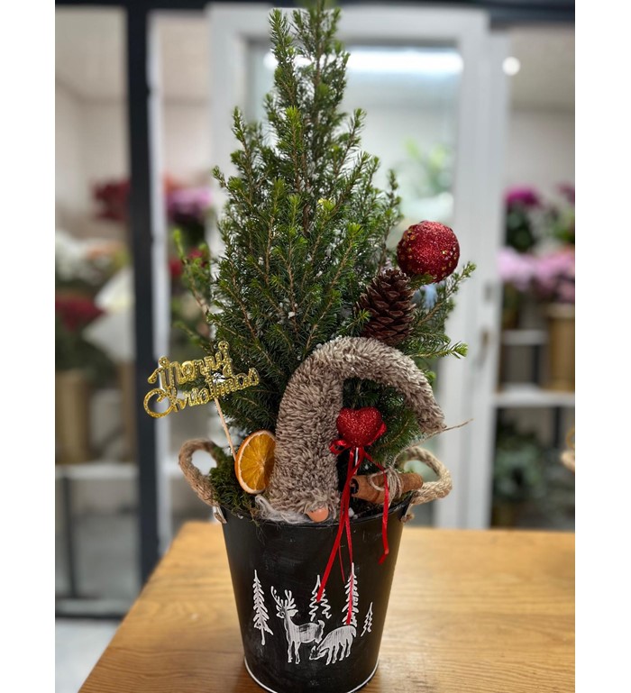 Çam ağaçı ve yılbaşı süslemeleri ve şans cücesi ile zenginleştirilmiş aranjman.