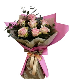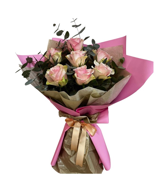 Pembe güller,okaliptus , kraft ve pembe ambalaj detaylarıyla tamamlanmıştır.